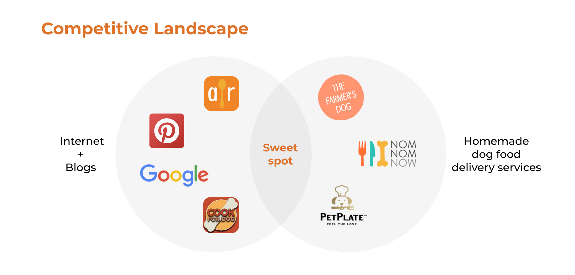 I did a competitive landscape analysis to see what other products and services are available in the market. Based on my research, there were some delivery services that provide fresh homemade dog meals in subscription basis available in the market. Besides that, there were articles and recipes about homemade dog foods available in several online platforms. The findings showed that no one has been provided a product for this particular propose yet. Having said that, there is an opportunity for developing a mobile app that provides homemade dog food recipes and knowledge around cooking for dogs.
