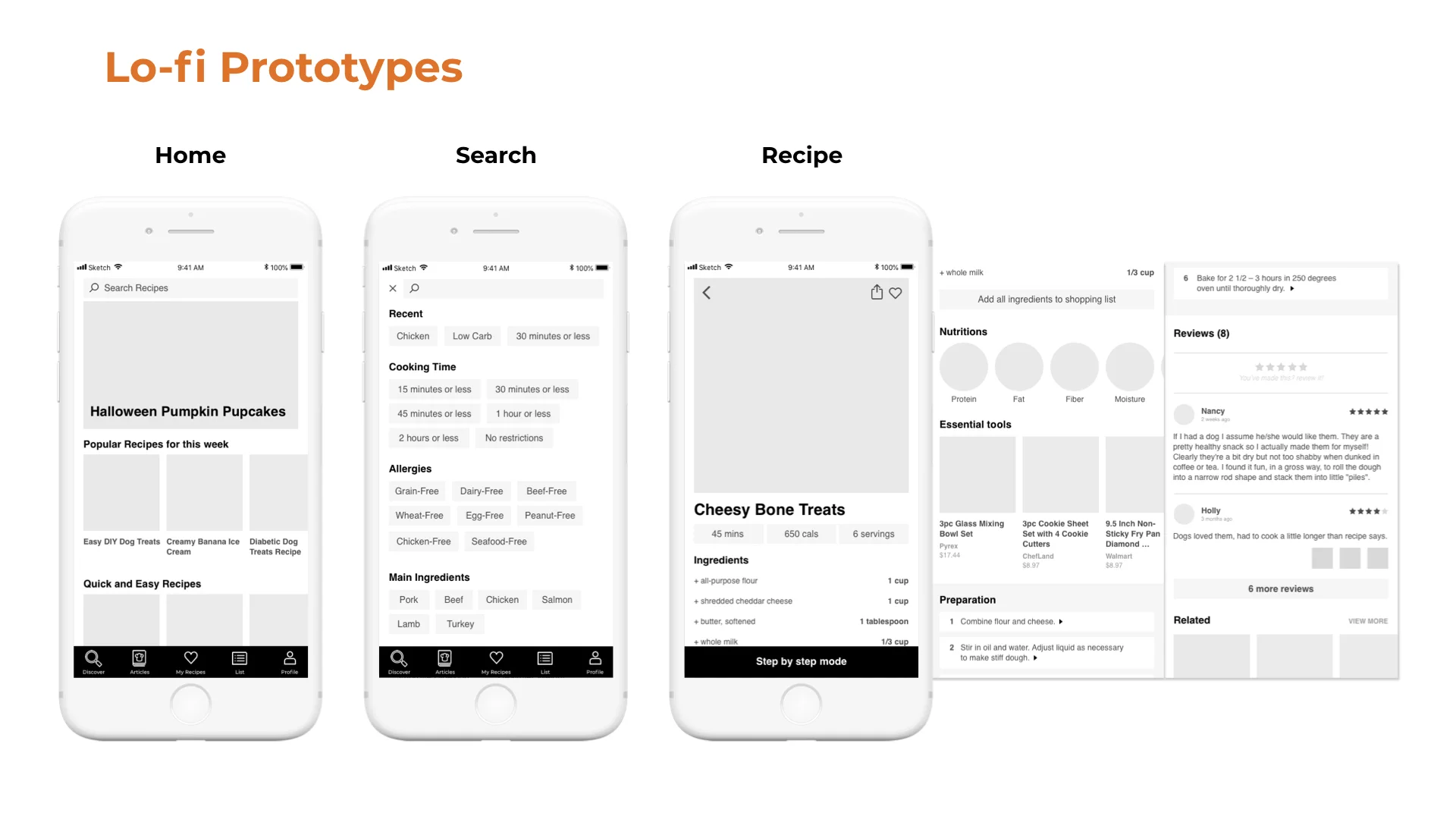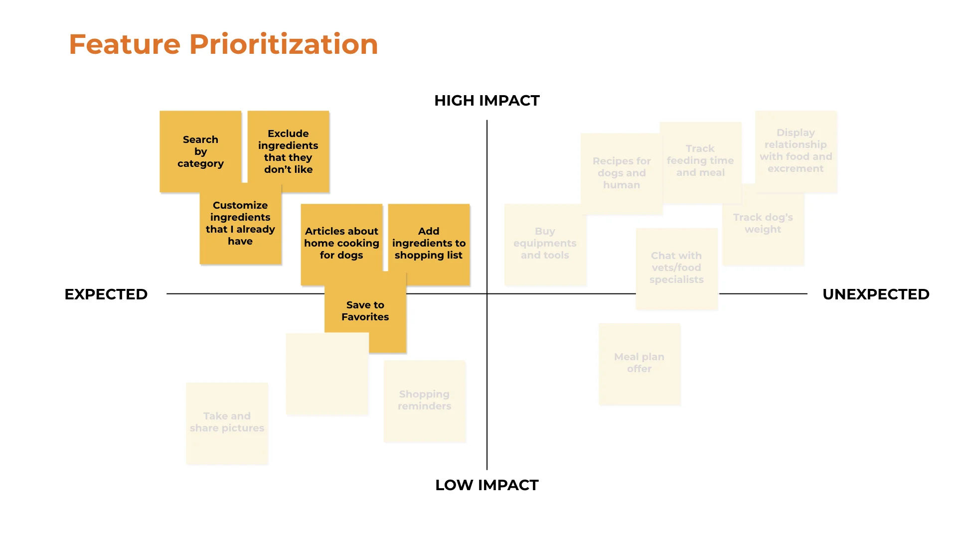 I created feature prioritization mapping by using expected/unexpected and high impact/low impact as the axes. I decided to tackle all of the features in the high impact quadrant, aiming to go the extra mile to impress the user with “Recipes for dogs and humans“ feature.