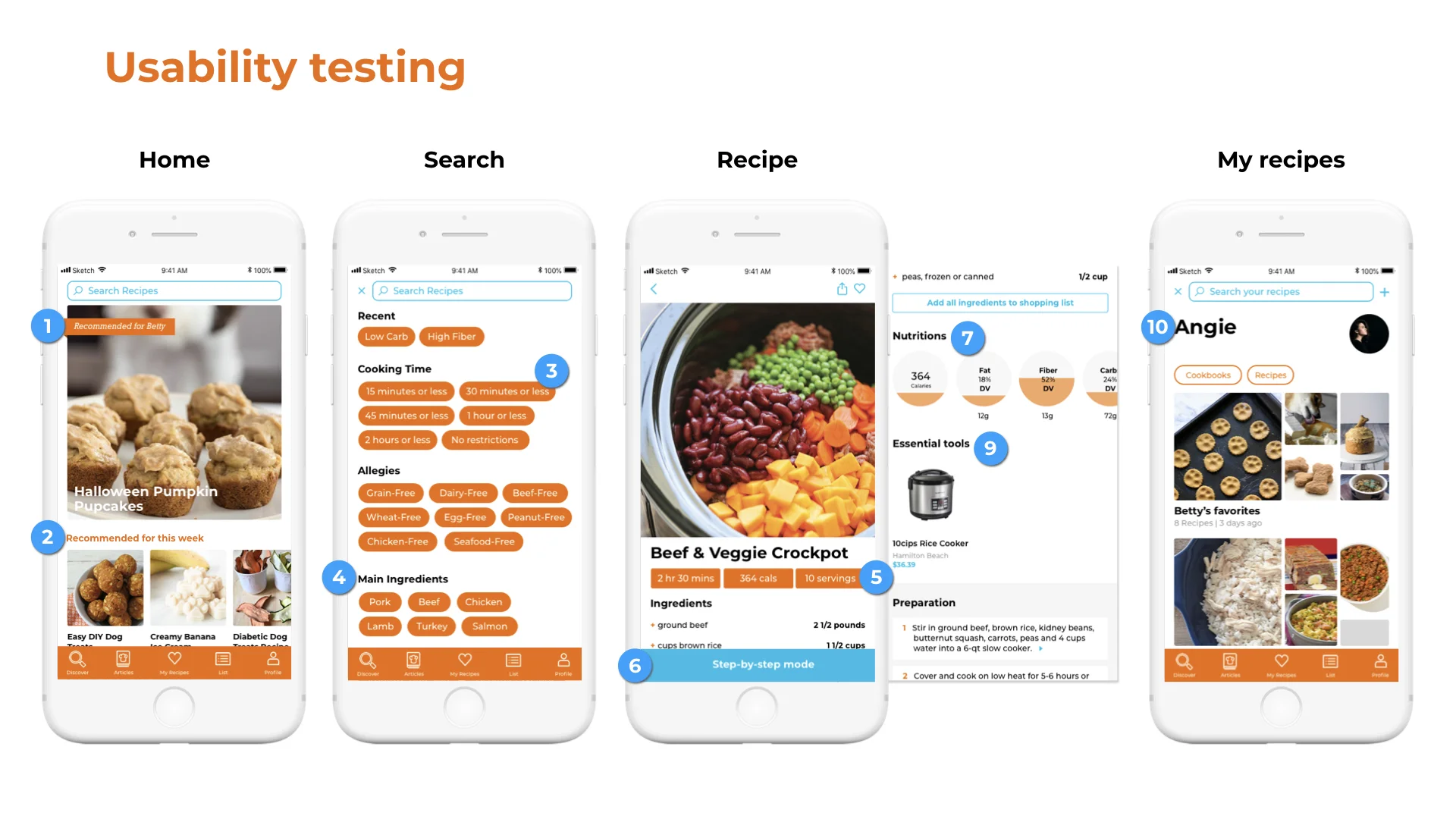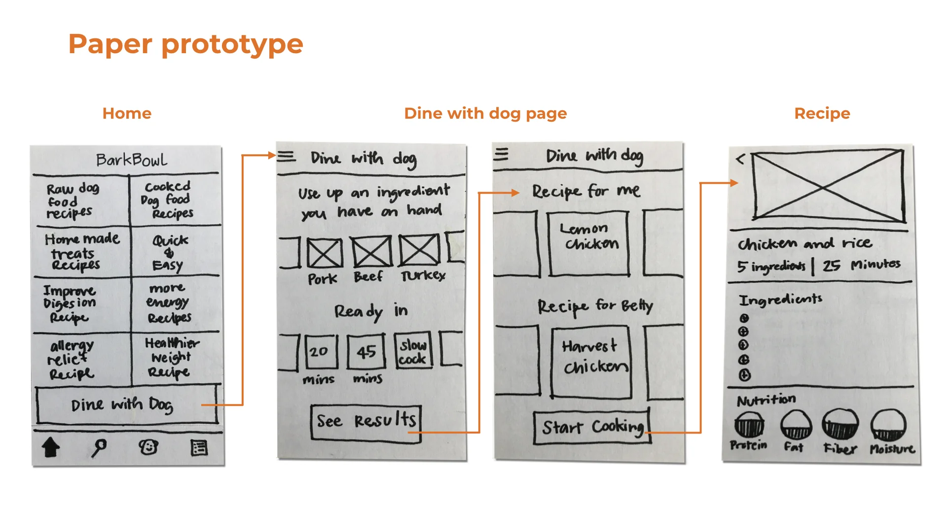 I then tested out my ideas for “Recipes for dogs and humans“ feature with paper prototyping, and I did a quick user testing to see if users could understand the feature.