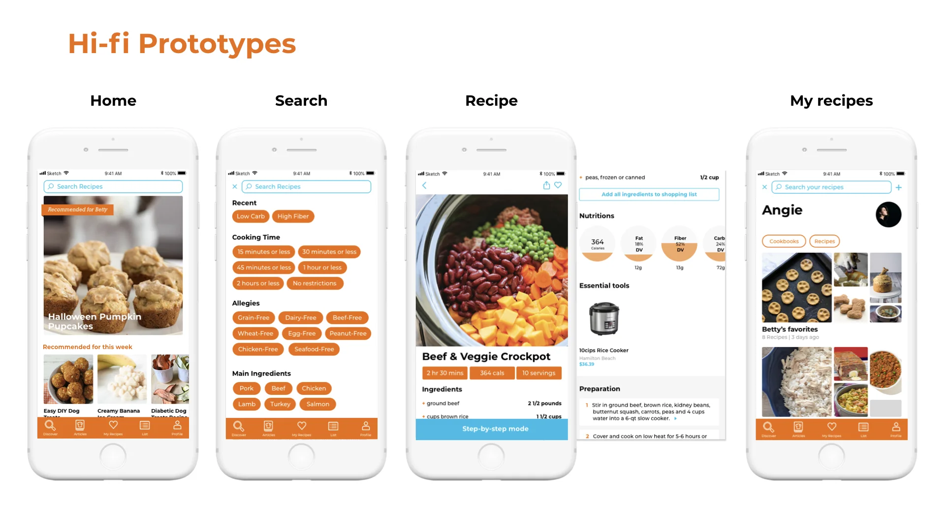 After the testing, users said that it was easy to navigate within the app but they had a hard time understanding the “Recipes for dogs and human“ feature with the basic recipes section. Additionally, recipes that work for both humans and dogs are very limited. Therefore, I decided to stick with the features in the top left corner for the launch of my MVP.